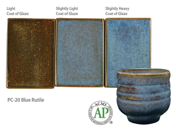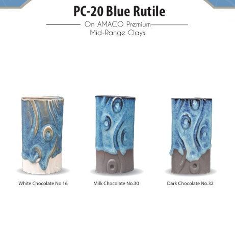 PC-20 Blue Rutile er en himmel-blå glasur, tilhørende Amaco’s Potter’s Choice (PC) serie. Den bryder gyldent hvor tynd. Denne serie glasurer egner sig både godt alene til glatte samt teksturerede overflader, men kan også lægges lag-på-lag i uendelige kombinationer med andre glasurer.